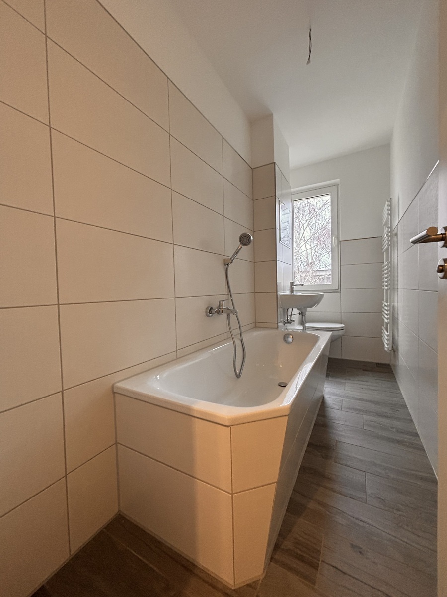 - mit Fliesen bestücktes Badezimmer mit Badewanne
